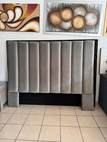 Esta elegante cabecera tapizada en terciopelo gris presenta un diseño moderno con paneles acolchados verticales que aportan textura y sofisticación a cualquier dormitorio. Su estructura robusta y acabados suaves la convierten en una pieza central ideal para una decoración contemporánea. Perfecta para camas tamaño queen o king, combina estilo y confort en un solo elemento. Ideal para quienes buscan un toque de lujo discreto en su habitación.