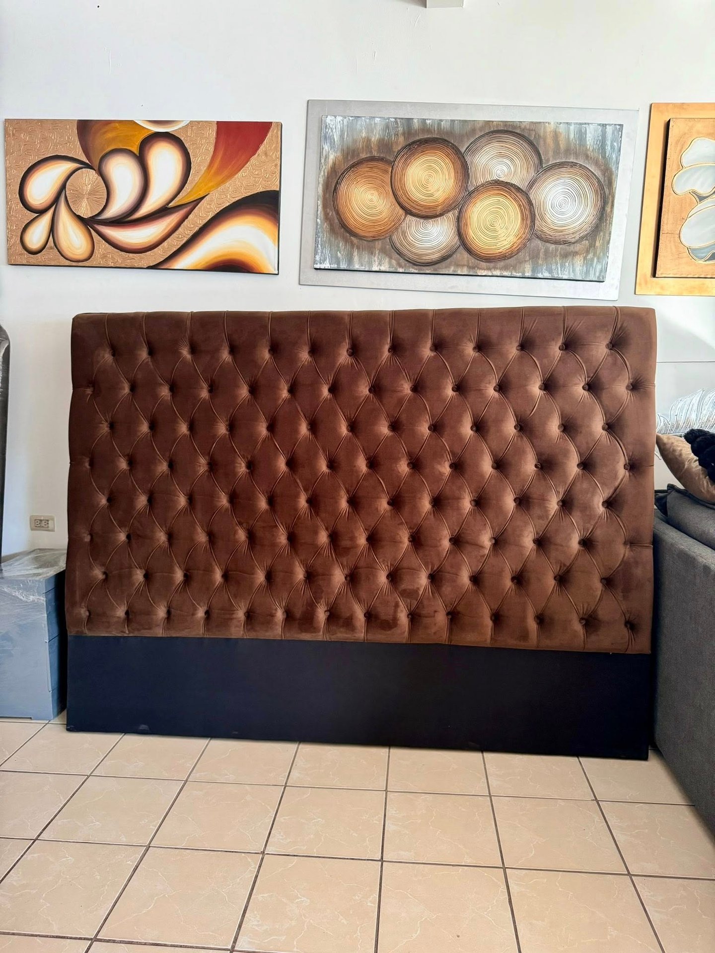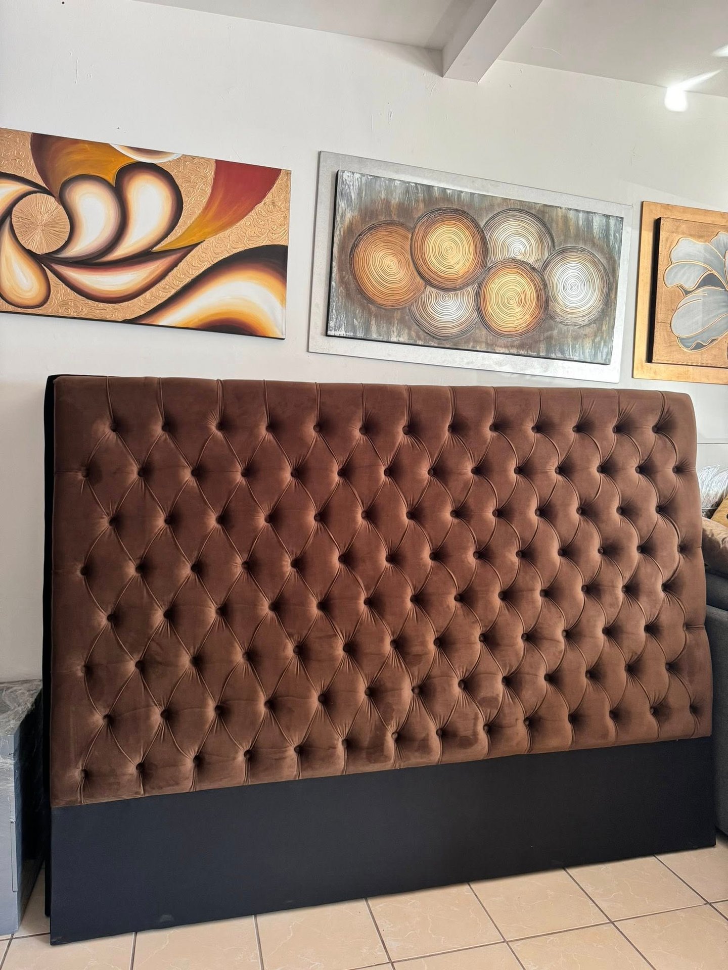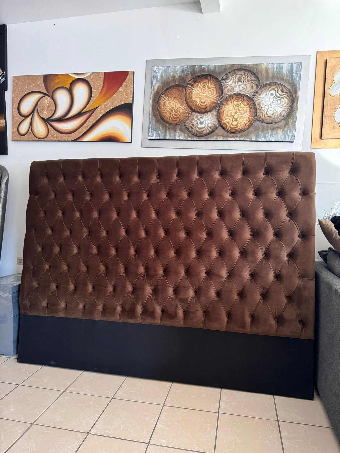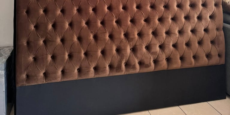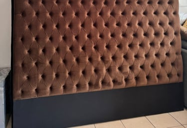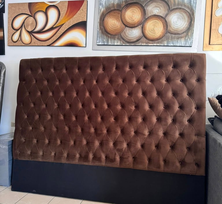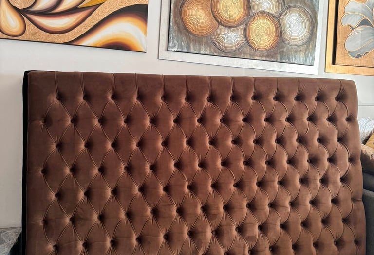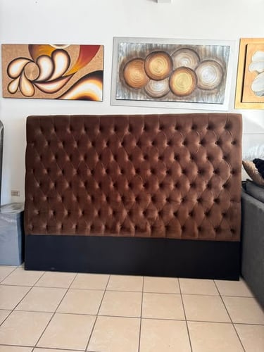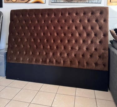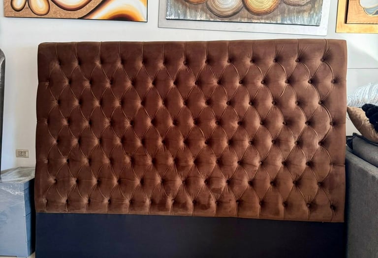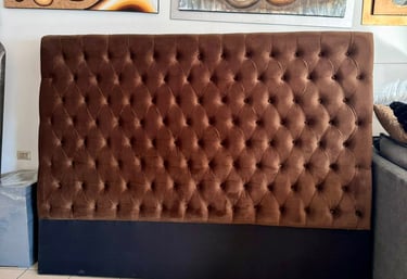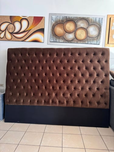 Inspirada en el lujo atemporal, esta cabecera combina la calidez del terciopelo marrón con una base sólida en tono negro mate, creando un contraste visual atractivo. Su patrón de botones profundos añade volumen y textura, haciendo de esta cabecera no solo un soporte funcional, sino también un elemento decorativo de alto nivel.