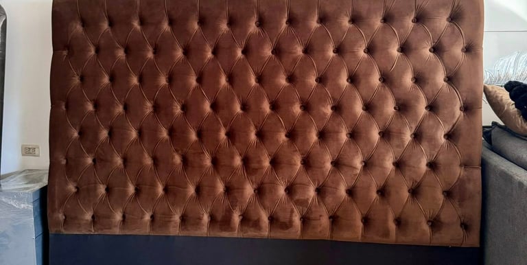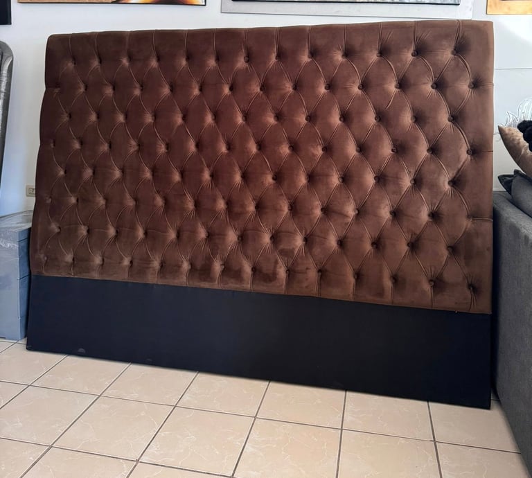 Esta cabecera tapizada en terciopelo color chocolate destaca por su diseño capitoné en rombos, aportando un aire de distinción a cualquier dormitorio. Su estructura robusta y acabados cuidadosamente detallados la convierten en una pieza central de alto impacto visual. Ideal para quienes buscan una mezcla entre sofisticación clásica y confort moderno.