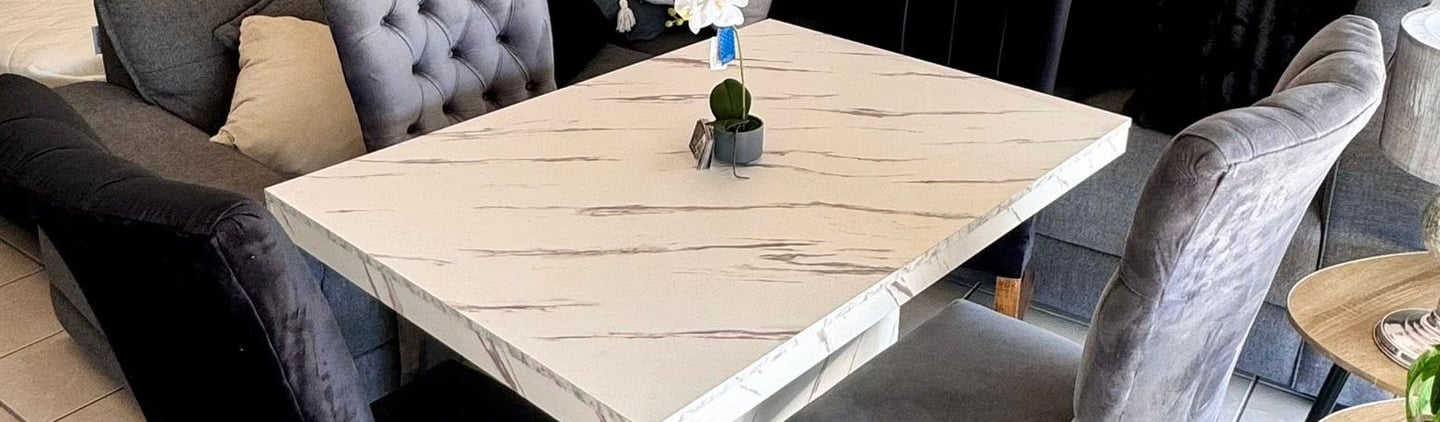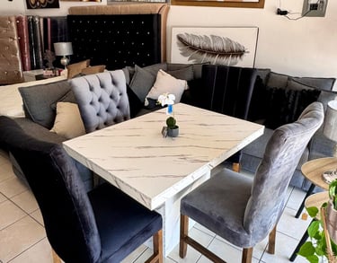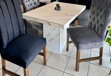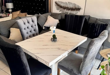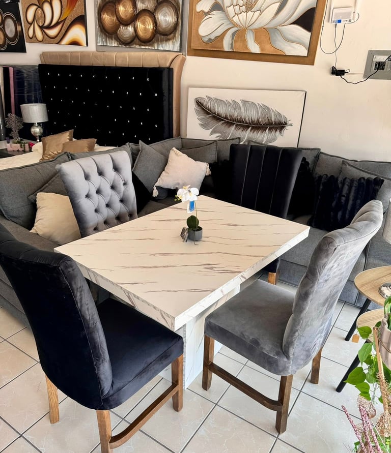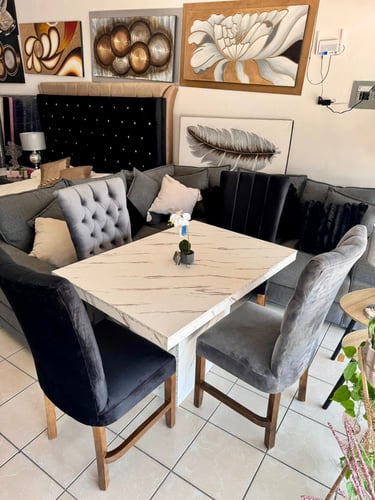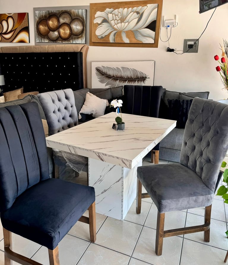 Este comedor une la suavidad de sus tapizados con la apariencia refinada de su superficie tipo mármol, creando un ambiente acogedor y moderno perfecto para compartir momentos especiales.