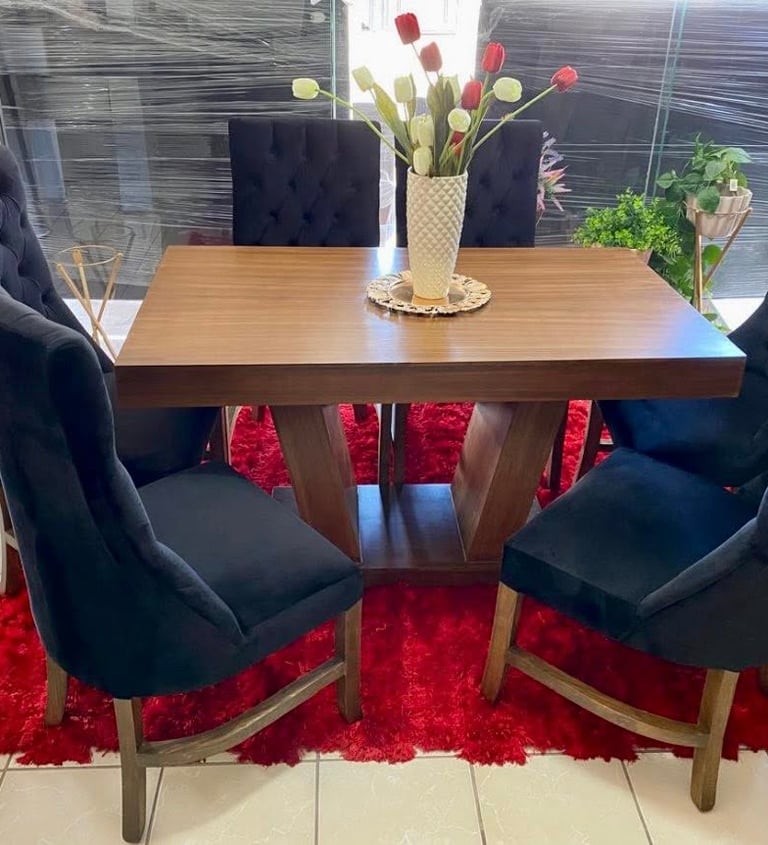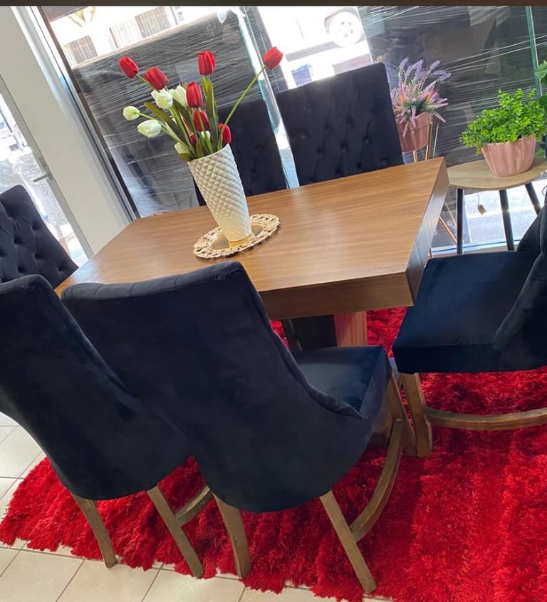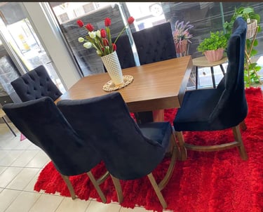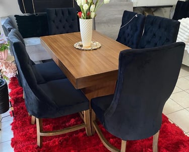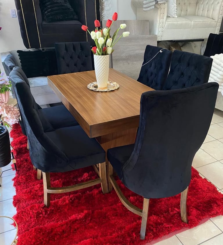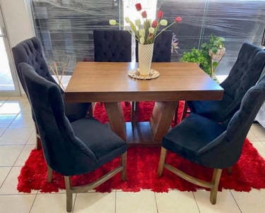 Elegante comedor con mesa rectangular de madera en tono nogal y base robusta de diseño contemporáneo. Incluye 6 sillas tapizadas en tela negra tipo terciopelo, con respaldo alto y capitonado que brindan comodidad y un toque sofisticado a cualquier espacio. Ideal para realzar tu comedor con estilo y confort.