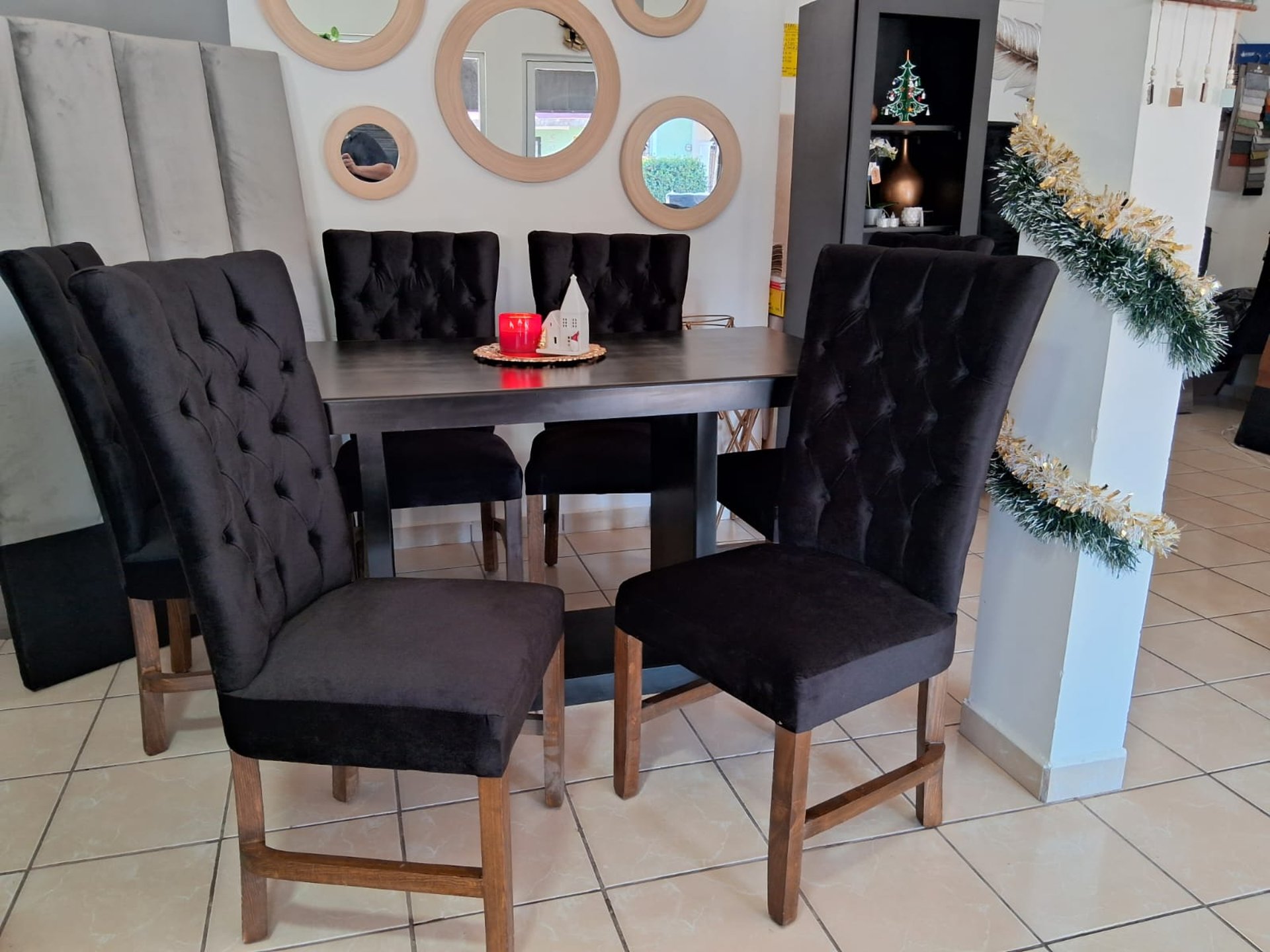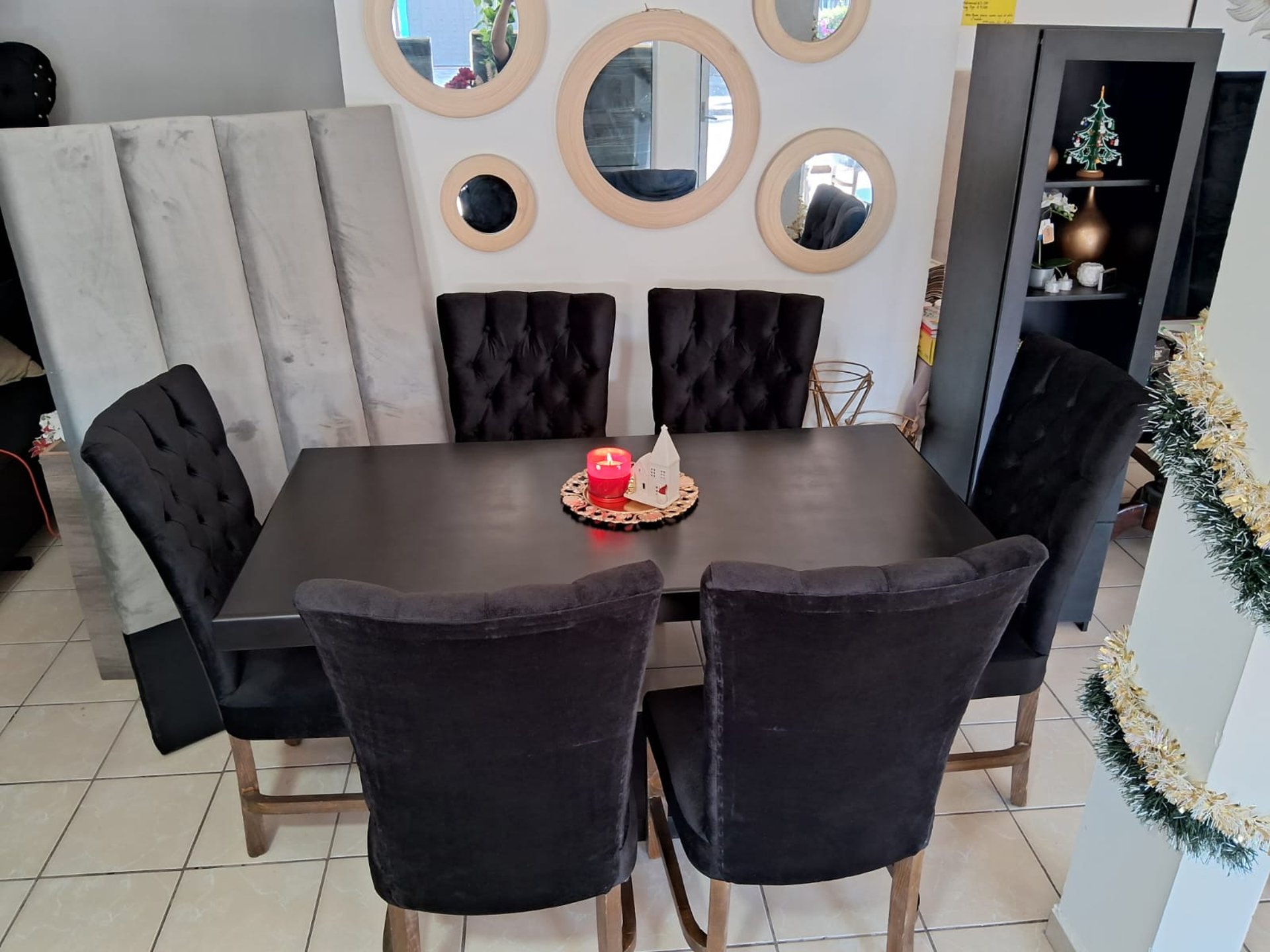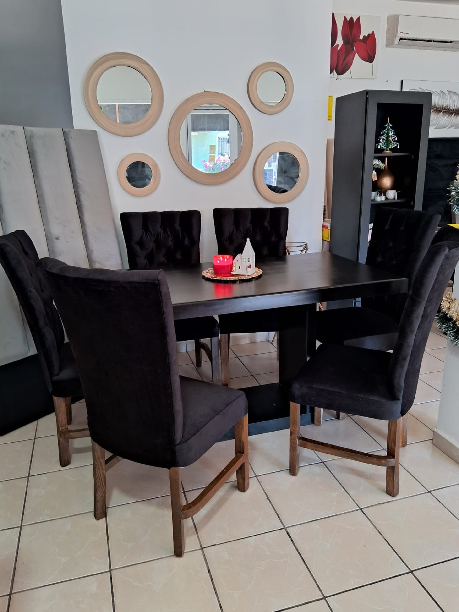 Este exquisito comedor Negro Azabache combina líneas modernas con un encanto atemporal. La mesa, de superficie sólida y acabado profundo en tono azabache, aporta una presencia imponente y refinada al espacio. Sus seis sillas tapizadas en un lujoso terciopelo negro azabache, con capitonado elegante y bases de madera robusta, envuelven el ambiente en una sensación de confort y distinción.