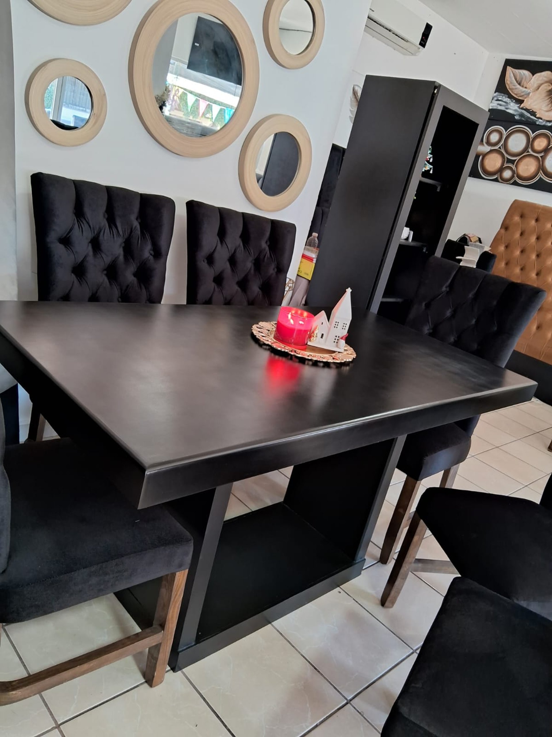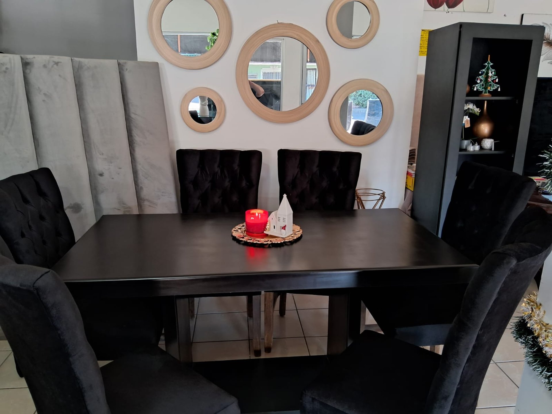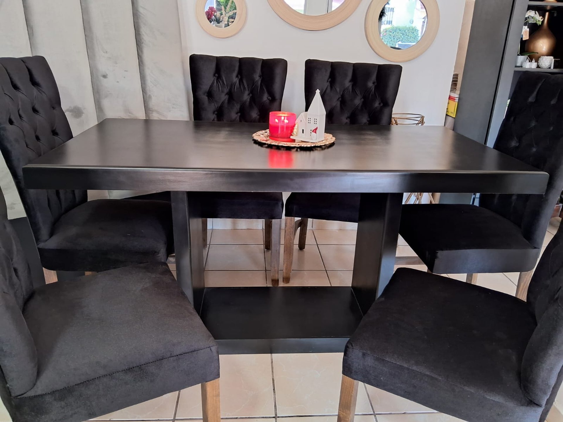 Este exquisito comedor Negro Azabache combina líneas modernas con un encanto atemporal. La mesa, de superficie sólida y acabado profundo en tono azabache, aporta una presencia imponente y refinada al espacio. Sus seis sillas tapizadas en un lujoso terciopelo negro azabache, con capitonado elegante y bases de madera robusta, envuelven el ambiente en una sensación de confort y distinción.