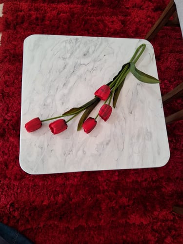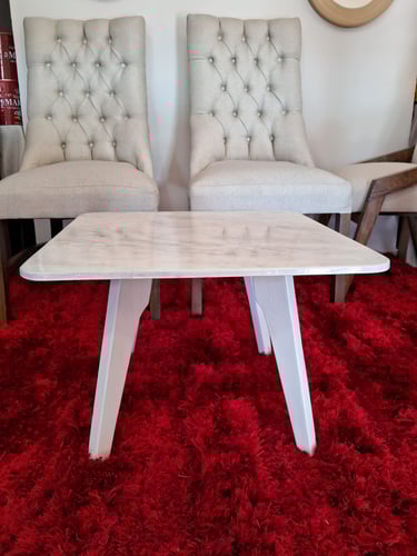 Elegante mesa de centro con un acabado epóxico que imita la textura y el brillo del mármol blanco, aportando un toque sofisticado y moderno a cualquier espacio. Su superficie lisa y resistente refleja un diseño minimalista, mientras que las patas de madera pintadas en blanco complementan perfectamente su estilo contemporáneo. Ideal para salas que buscan un equilibrio entre funcionalidad y estética refinada.