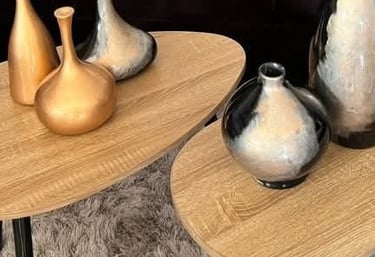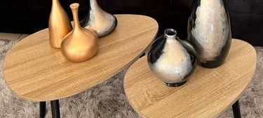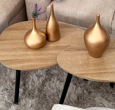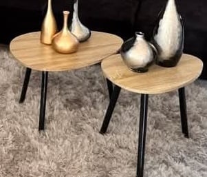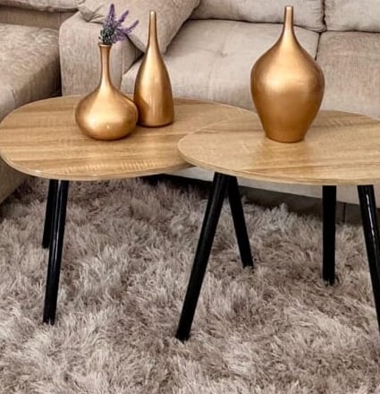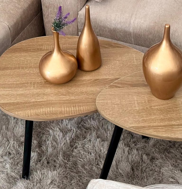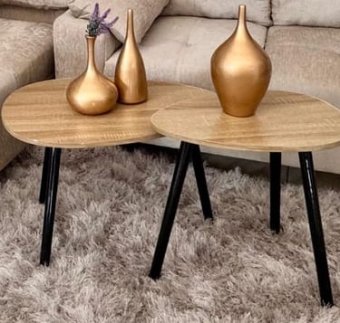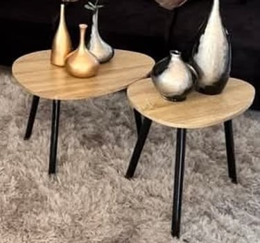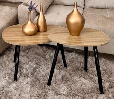 Este conjunto de mesas auxiliares combina superficies de MDF con acabado en madera natural y patas de metal en negro mate. Ideal para salas pequeñas o como acento decorativo, su diseño curvo aporta calidez y movimiento al ambiente.