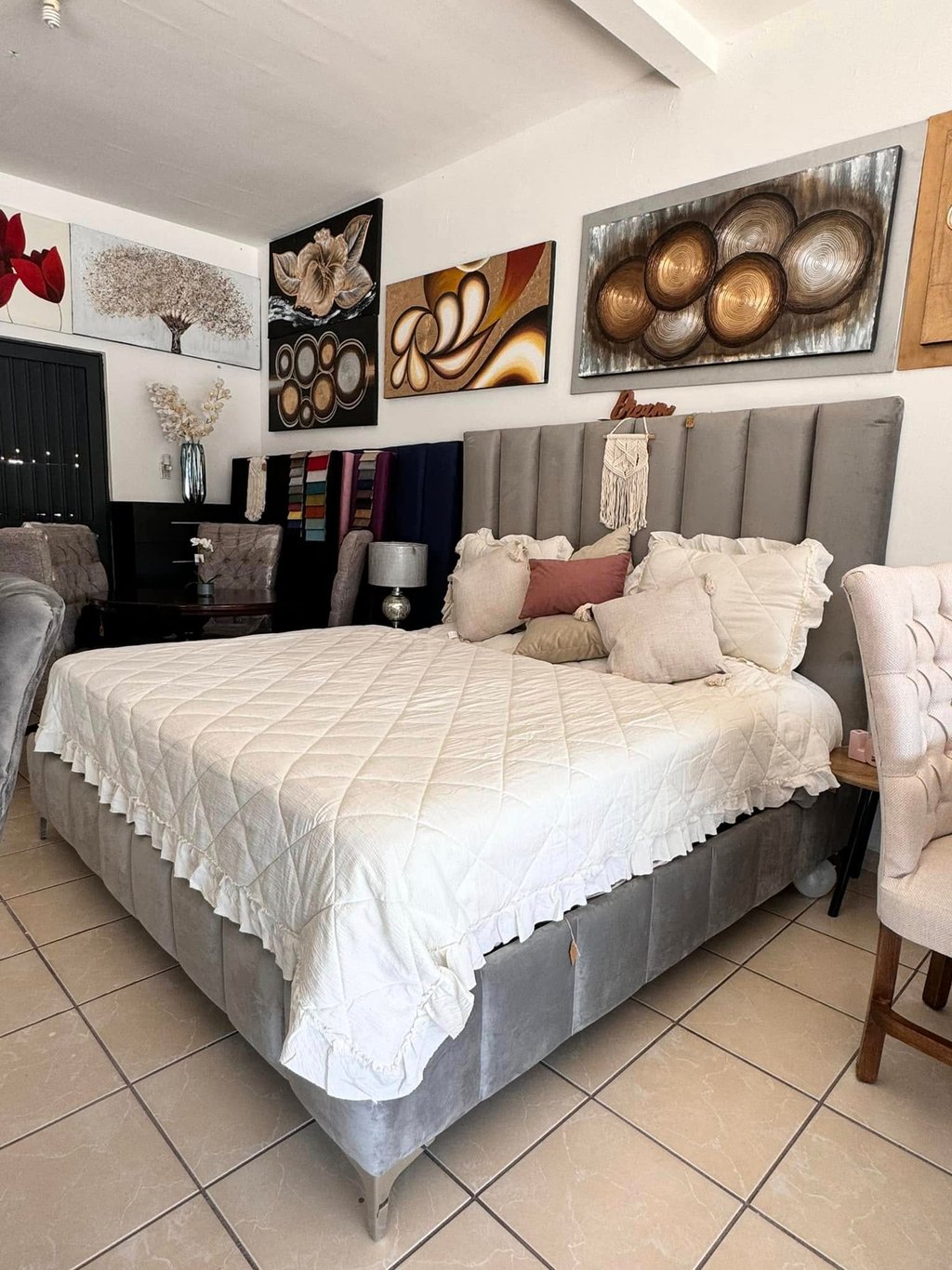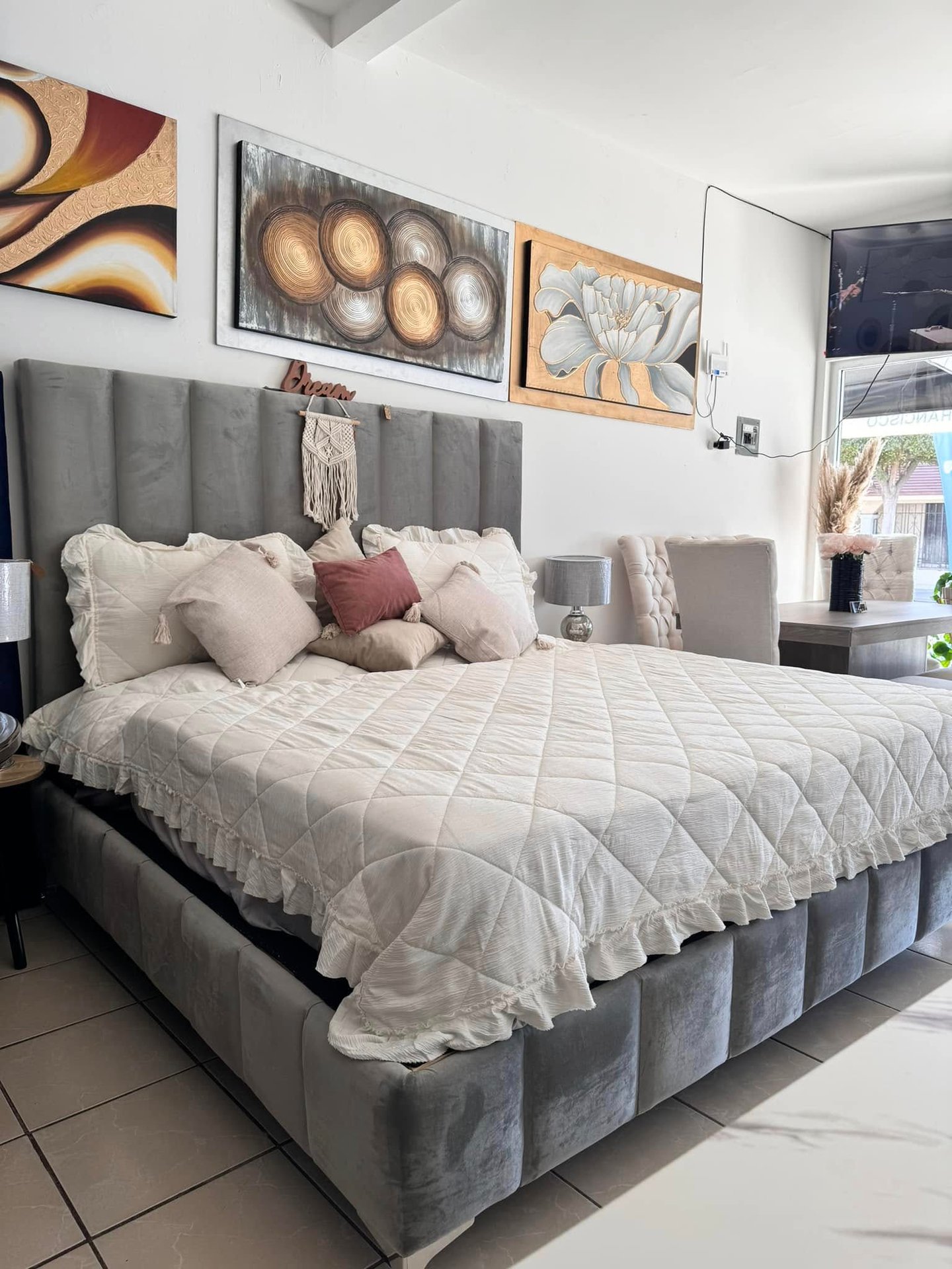 Con líneas verticales marcadas y acabado en terciopelo gris, esta cama se convierte en el punto focal de cualquier habitación. Ideal para quienes buscan elegancia, comodidad y un ambiente acogedor.