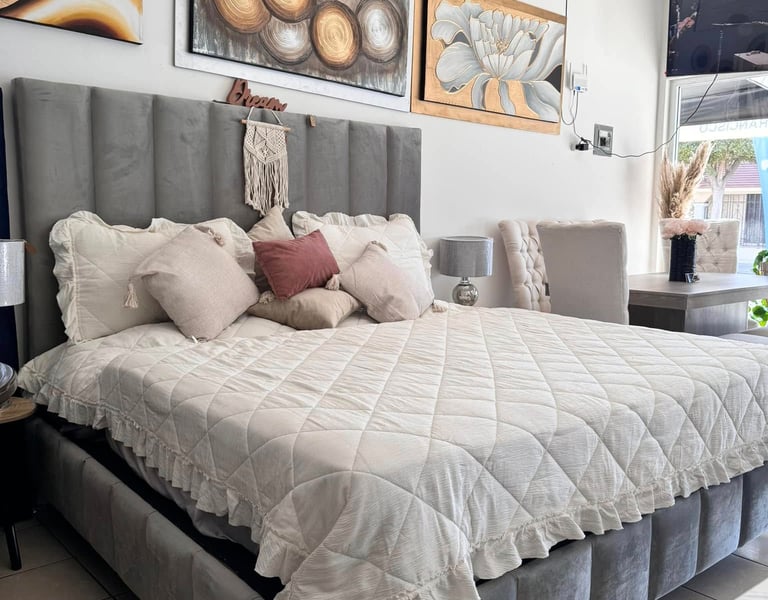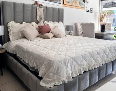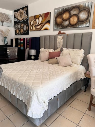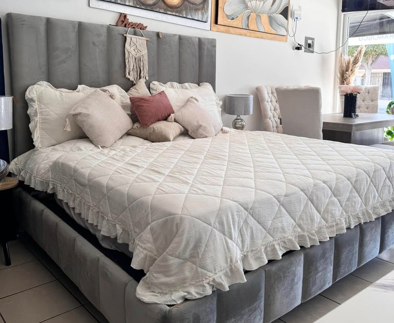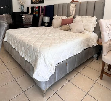Cama tapizada en suave terciopelo gris con cabecera alta acolchonada y base reforzada. Su diseño transmite elegancia y modernidad, creando un ambiente acogedor y sofisticado en cualquier dormitorio. La textura aterciopelada aporta calidez visual y suavidad al tacto, mientras que su estructura sólida garantiza durabilidad y confort. Una pieza que combina estilo, funcionalidad y descanso de lujo para quienes buscan elevar la estética de su espacio personal.