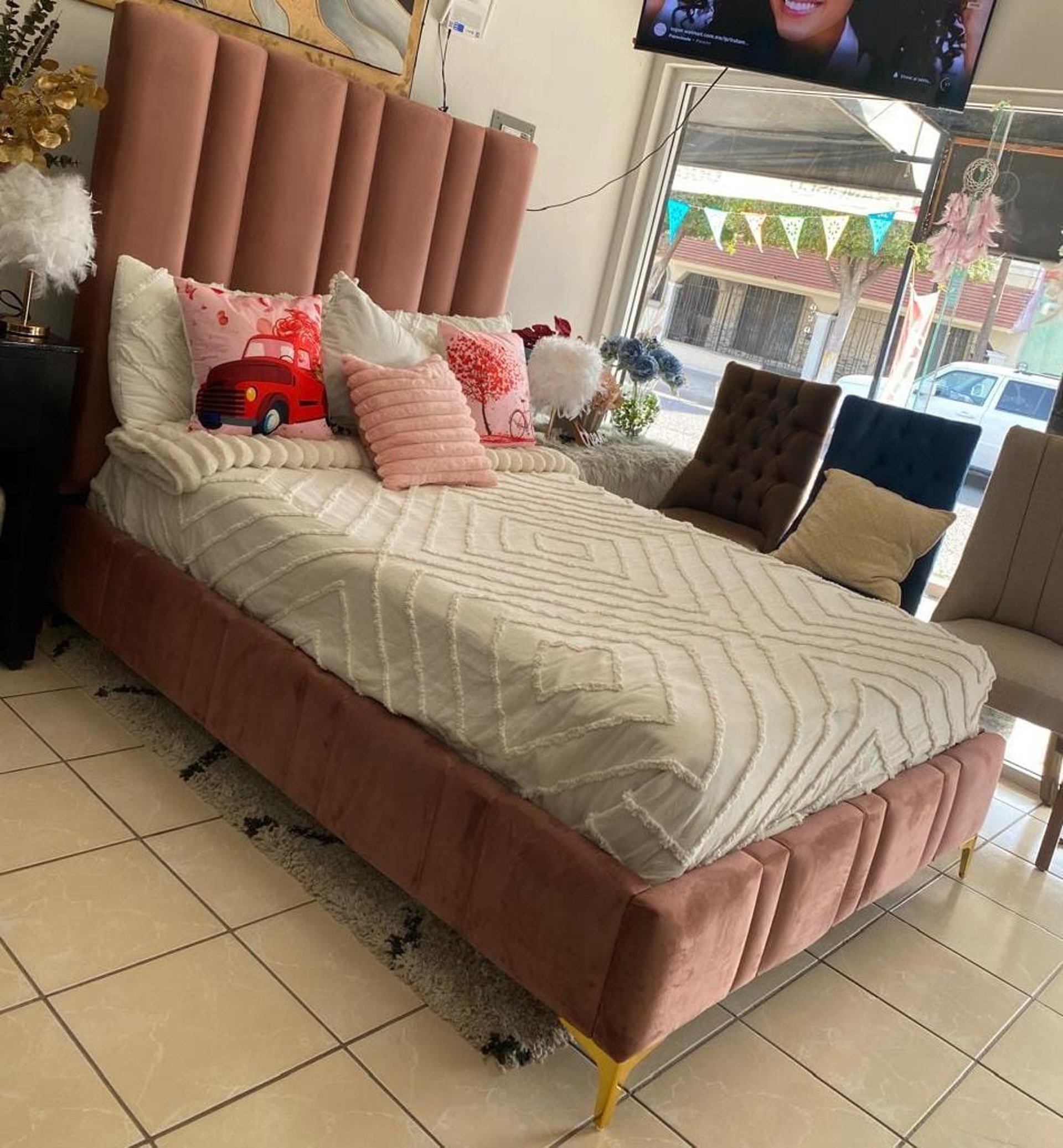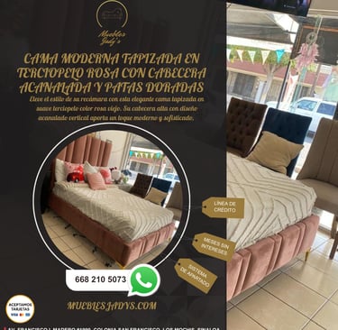 Tapizada en terciopelo rosa, suave al tacto y visualmente impactante.