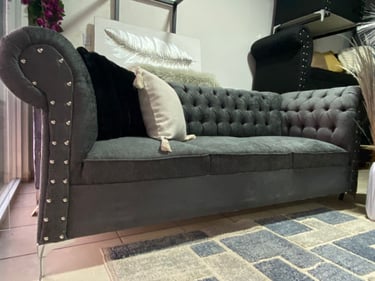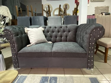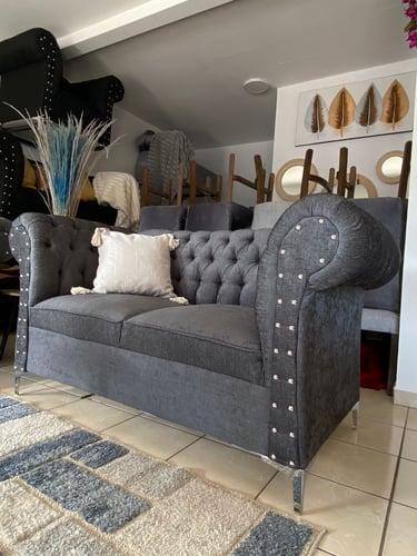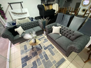 Esta sala doble, en un tono gris oscuro, presenta un diseño elegante con respaldo tuftado, lo que añade un toque clásico. Los bordes de los sillones están adornados con remaches metálicos que proporcionan un contraste sutil pero sofisticado. La estructura de los sillones es robusta, con una forma envolvente que invita al confort, combinando perfectamente lo clásico con detalles modernos.