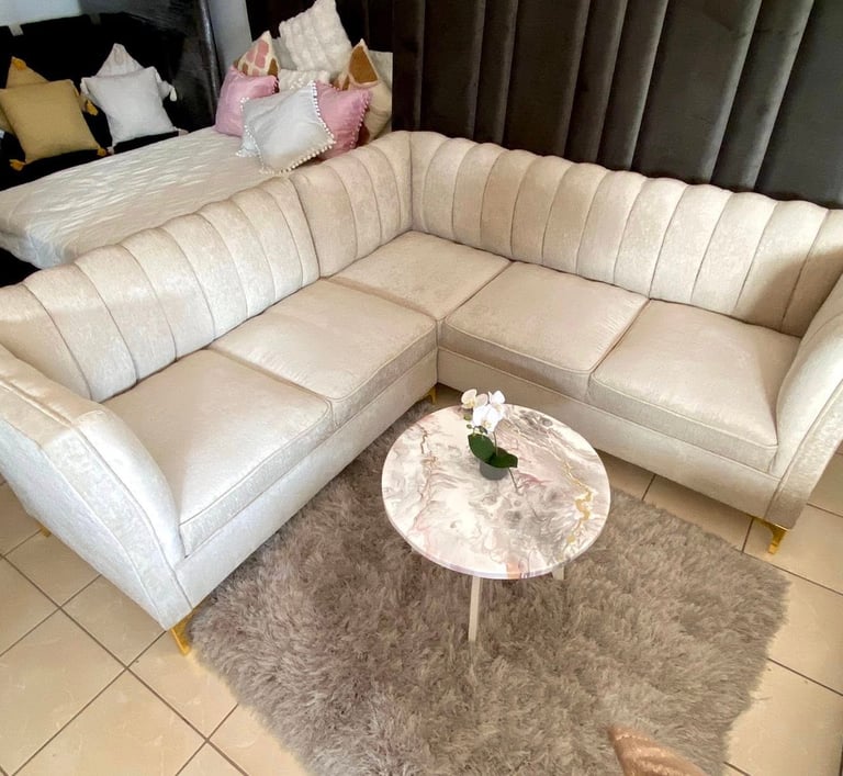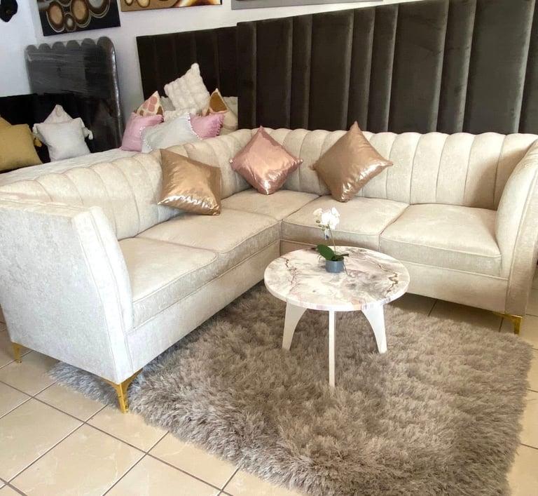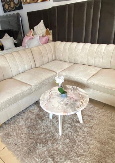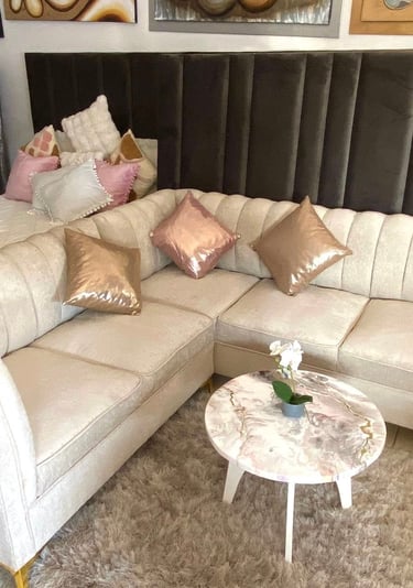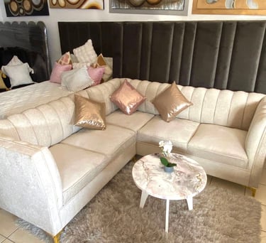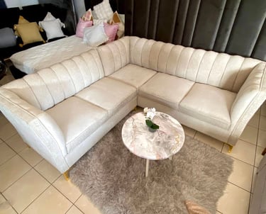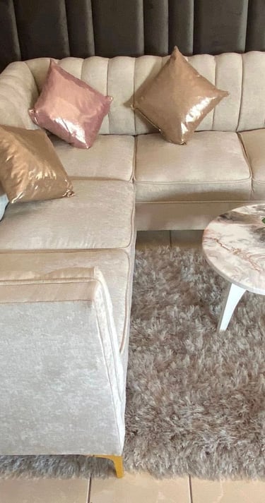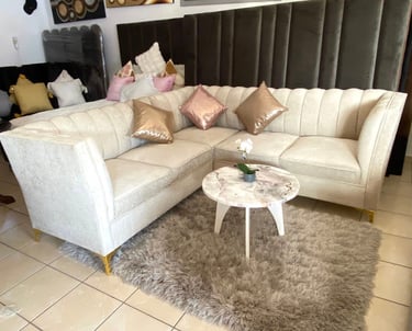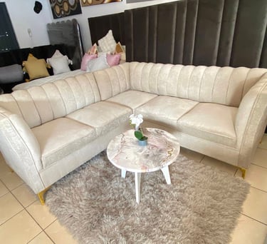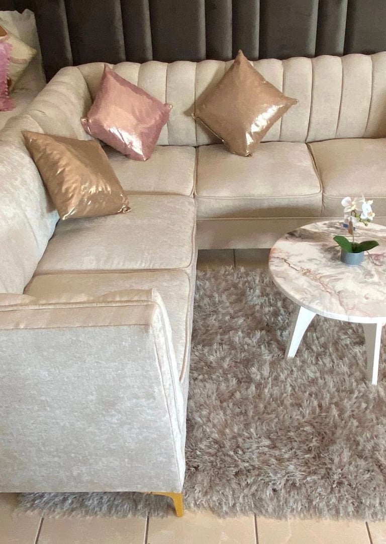 Esta sala esquinera en color beige destaca por su diseño elegante y versátil, ideal para crear un ambiente acogedor y sofisticado. Sus patas de madera natural aportan calidez y resistencia, mientras que los cojines decorativos en tonos dorados y colores vibrantes añaden un contraste llamativo y lleno de personalidad. Acompañada de una mesa auxiliar redonda con cubierta de efecto mármol, esta sala no solo ofrece comodidad con asientos amplios y firmes, sino también un equilibrio perfecto entre estilo moderno y funcionalidad, convirtiéndose en el punto focal de cualquier espacio.