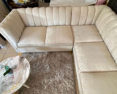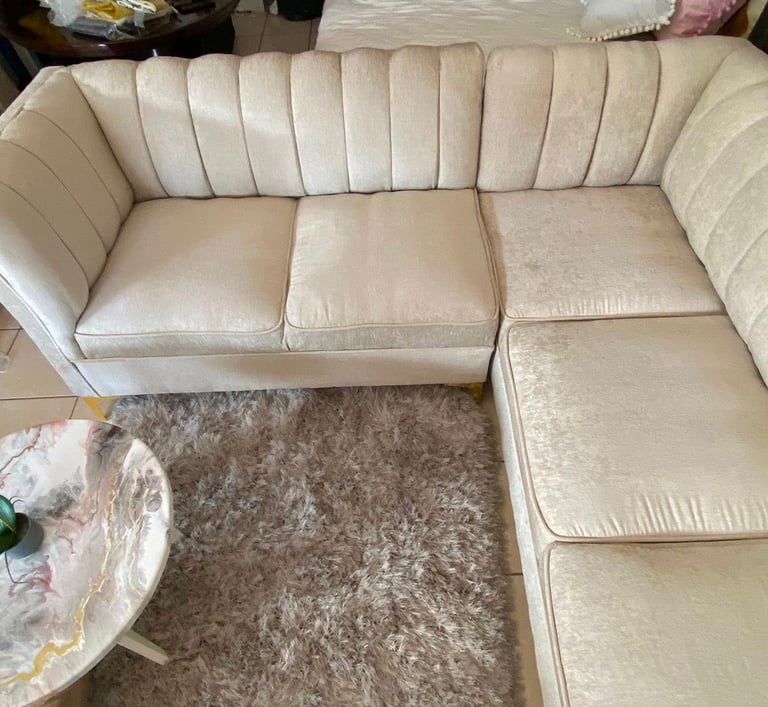 Sala Esquinera Beige con Toques Modernos y Mesa Auxiliar Mármol