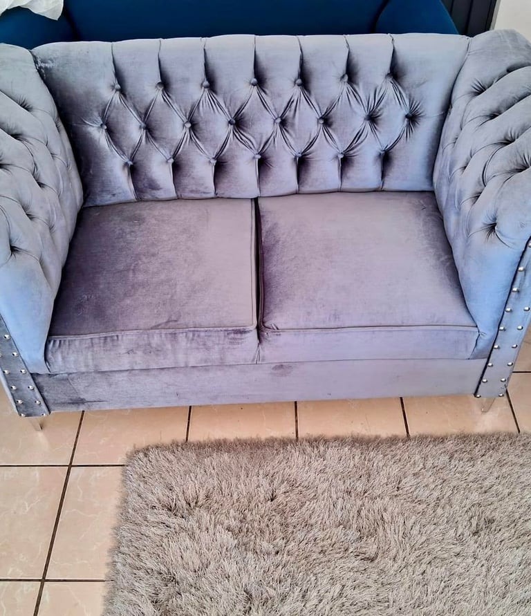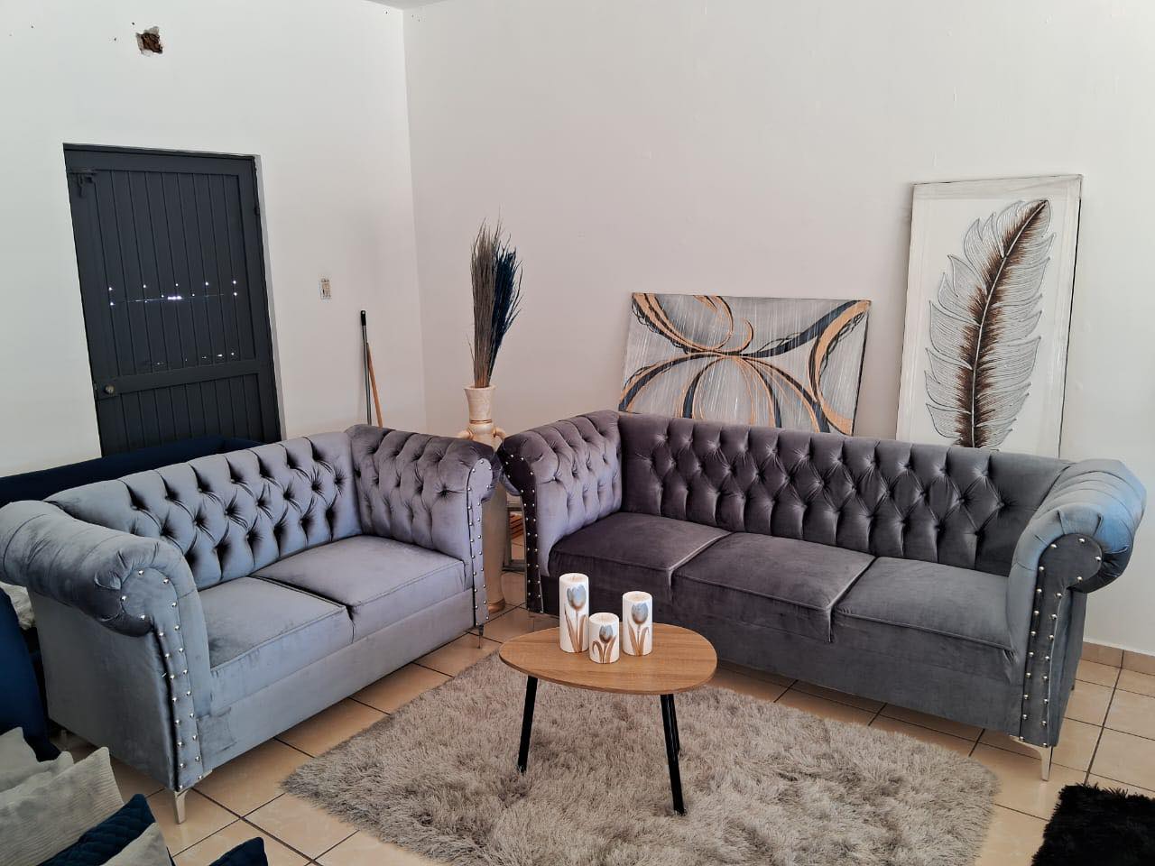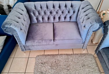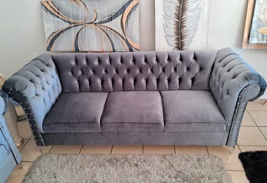 Los sofás estilo Chesterfield en terciopelo gris aportan un aire de distinción con su tapizado capitoné y detalles de tachuelas metálicas. Perfectos para ambientes formales o modernos.