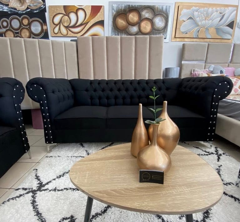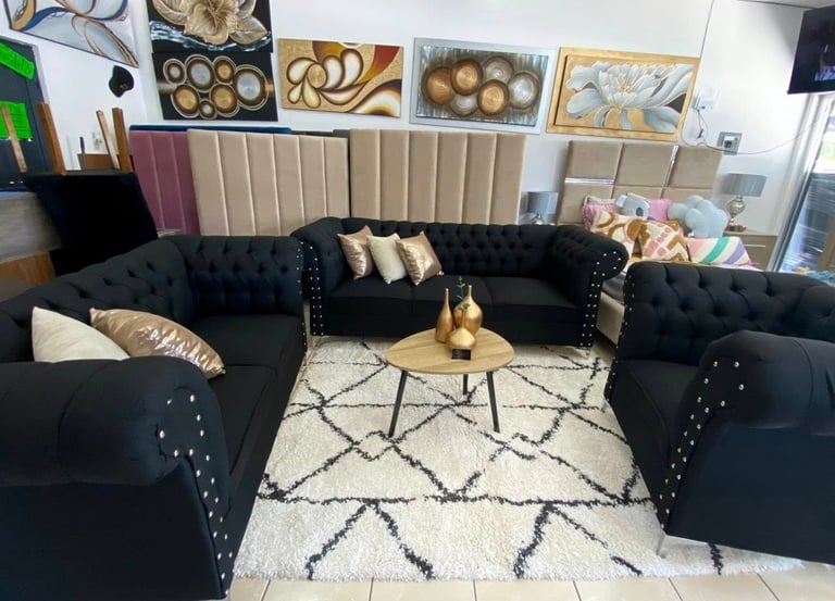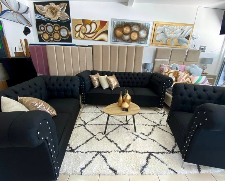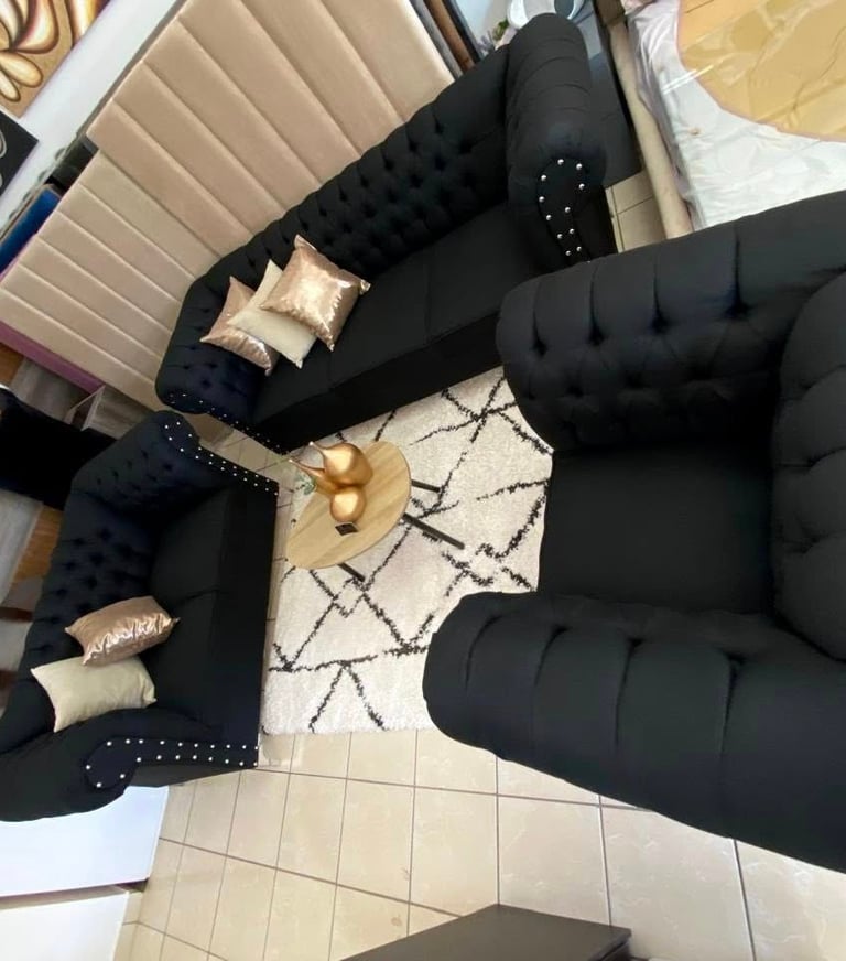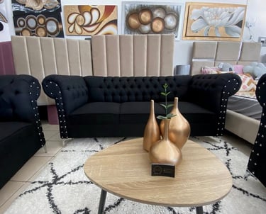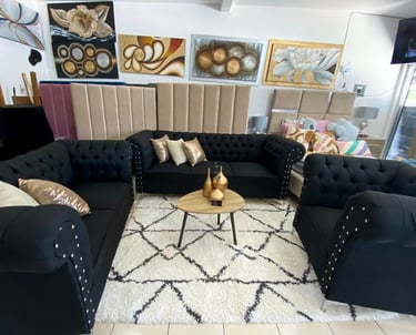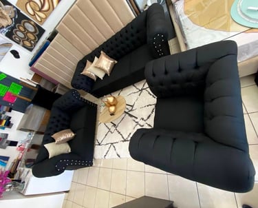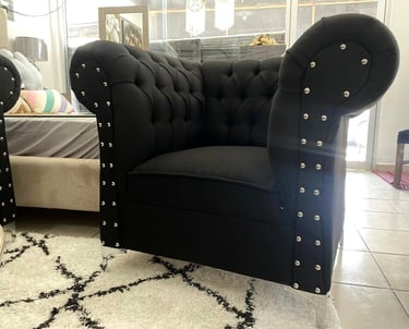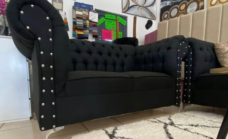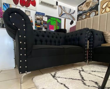 Eleva la elegancia de tu hogar con esta sala estilo Chesterfield en color negro. Su diseño clásico con capitonado profundo y detalles de botonadura con aplicaciones metálicas aporta sofisticación y carácter a cualquier espacio. Los cojines decorativos en tonos metálicos añaden un contraste moderno, mientras que sus asientos firmes garantizan comodidad y durabilidad. Ideal para quienes buscan un ambiente distinguido y acogedor.