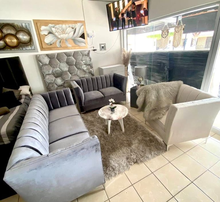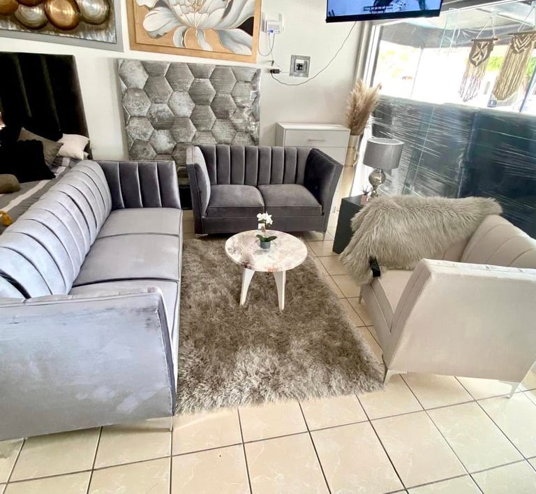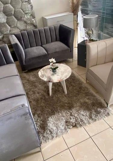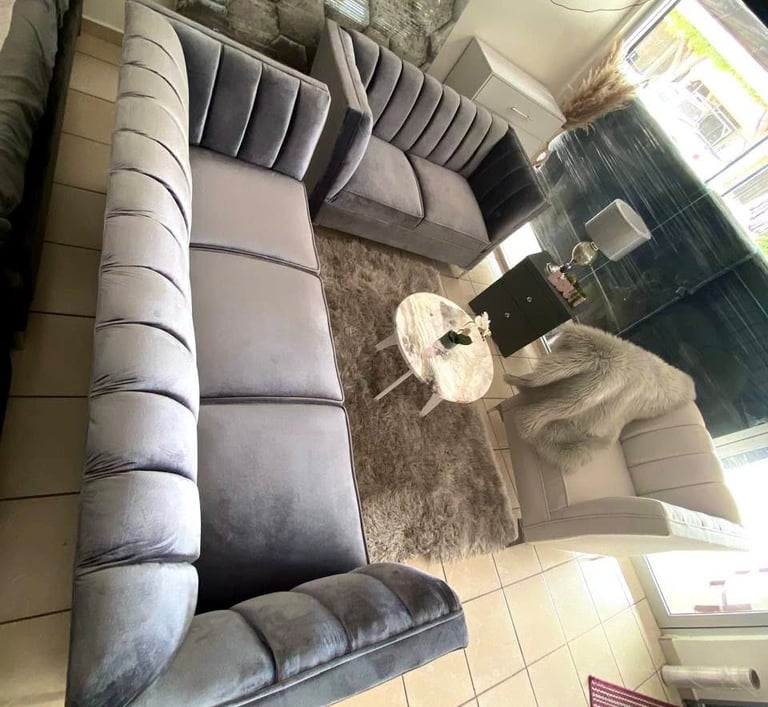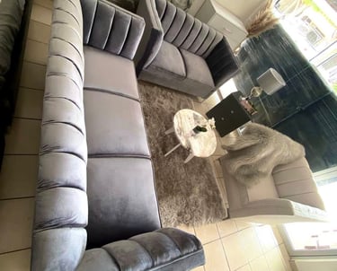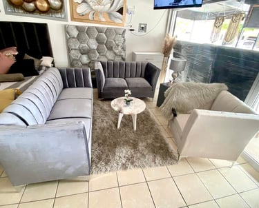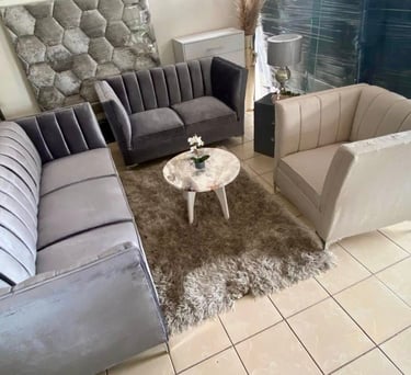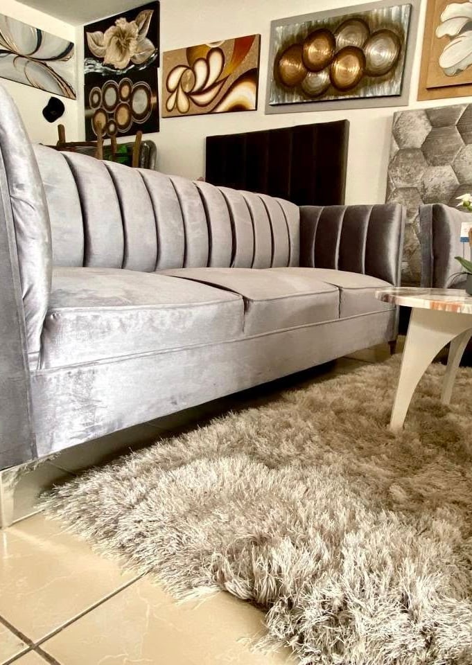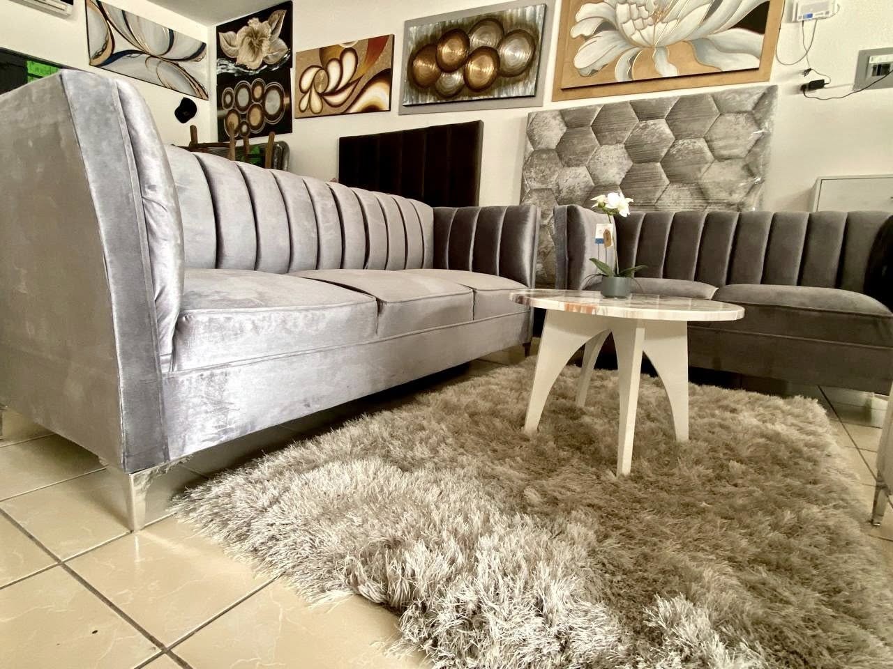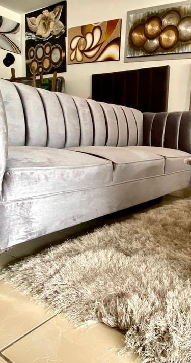 Conformada por un set de sofás tapizados en terciopelo gris con costuras acanaladas y brazos rectos, esta sala aporta sofisticación y confort en un mismo espacio. Su diseño moderno combina perfectamente con tonos neutros, creando un ambiente acogedor y elegante ideal para compartir momentos especiales.