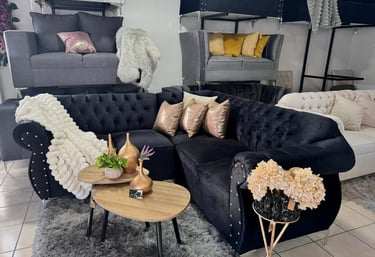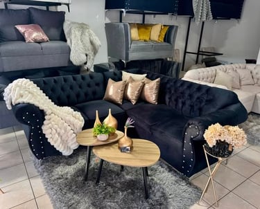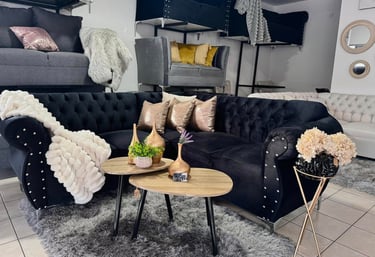 Esta sala en tono negro profundo destaca por su diseño tipo chesterfield con capitoné en respaldo y brazos, aportando un toque clásico y sofisticado al espacio. Los cojines en tonos metálicos rosados contrastan sutilmente, añadiendo un brillo moderno sin romper la armonía. Ideal para interiores que buscan lujo con personalidad.
