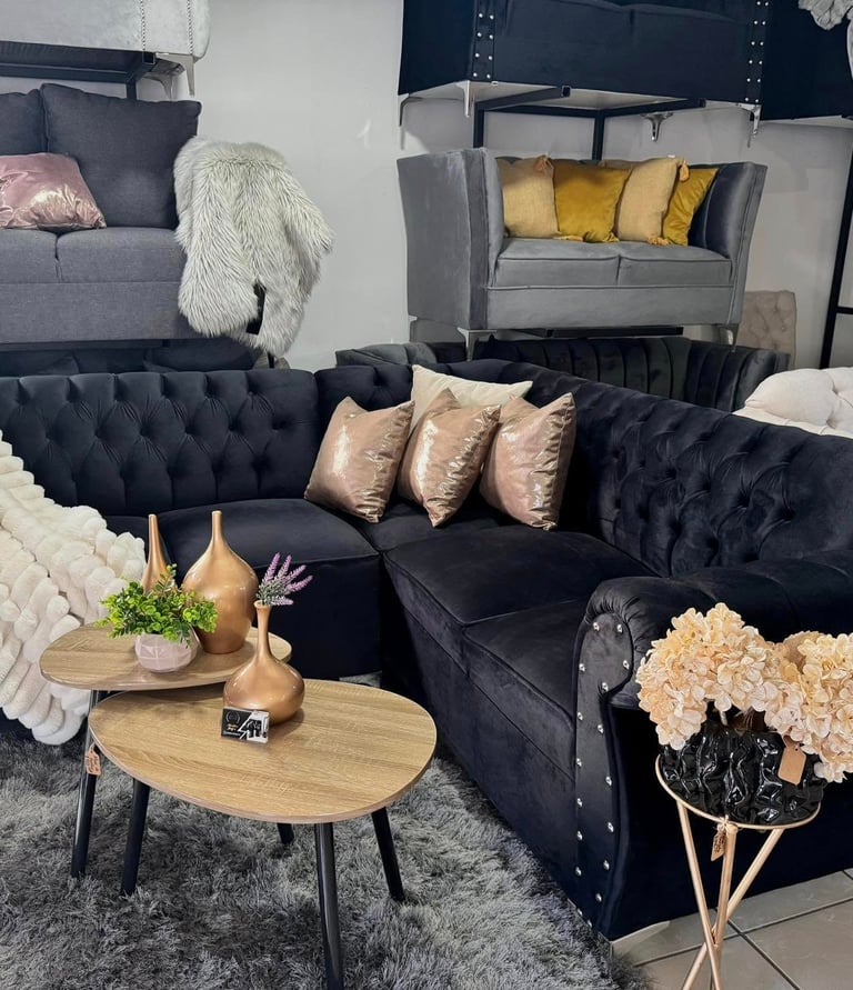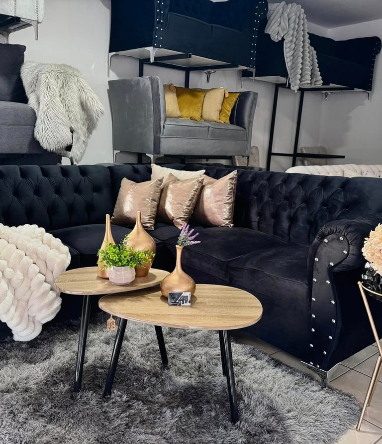 Una sala con carácter contemporáneo y detalles glamurosos. El tapizado negro de textura suave se complementa con tachuelas plateadas en los brazos curvos, mientras que los cojines satinados en rosa dorado elevan el estilo general. Perfecta para ambientes urbanos que combinan confort y distinción.