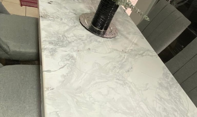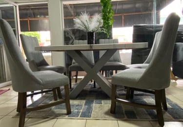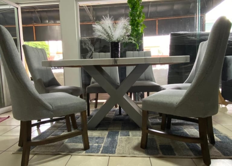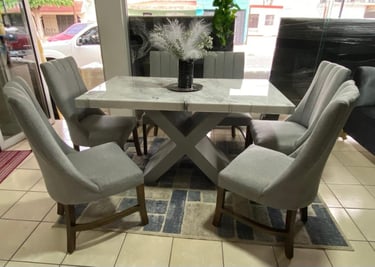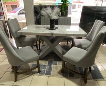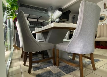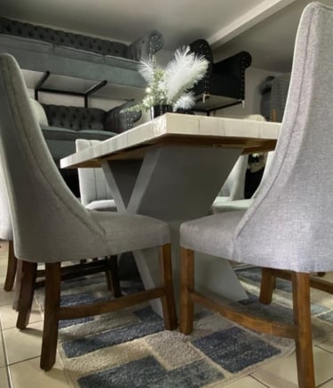 Una combinación perfecta entre estética y funcionalidad. Su acabado en resina epóxica ofrece un aspecto sofisticado y una textura única, mientras que sus sillas tapizadas brindan la comodidad ideal para disfrutar cada reunión.
