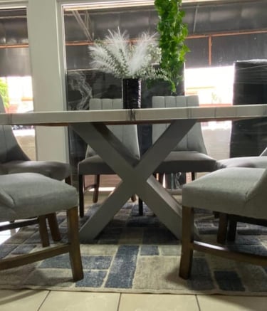 Este comedor destaca por su cubierta de resina epóxica, una superficie brillante y resistente que aporta elegancia y durabilidad. Su base en forma de “X” brinda estabilidad y un toque moderno ideal para espacios contemporáneos.