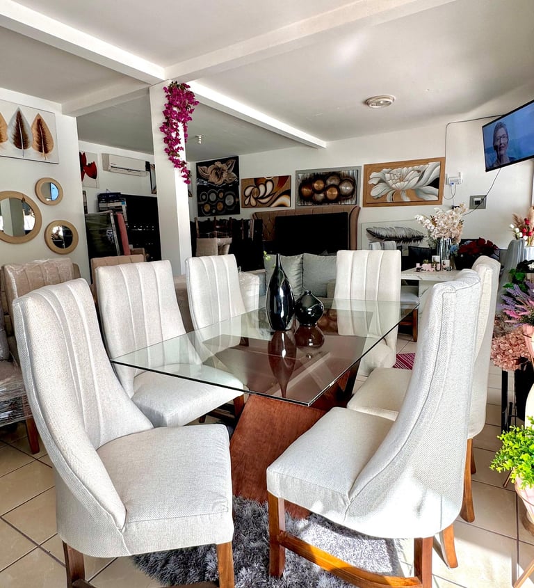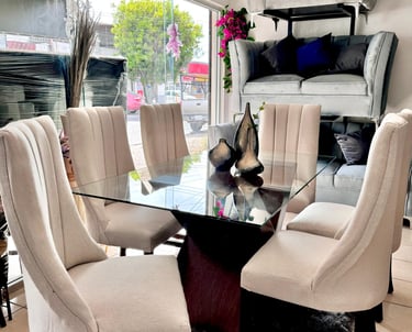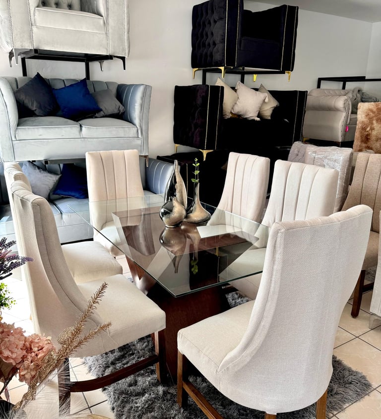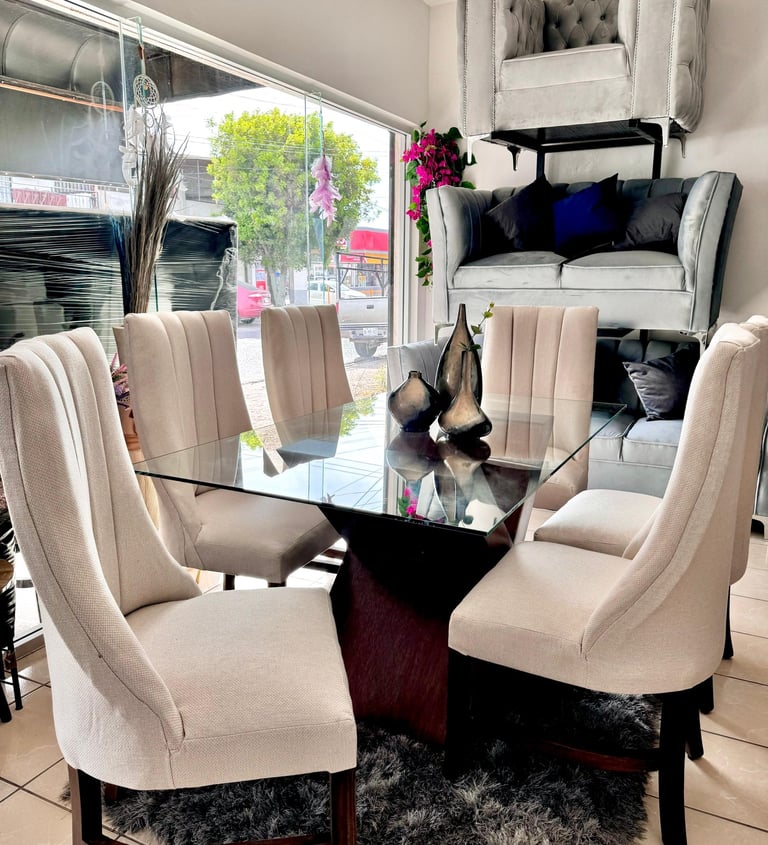 Mesa rectangular de cristal con diseño moderno y base geométrica, acompañada de 6 sillas tapizadas en tela blanca con respaldo alto y capitonado elegante. Su estilo sofisticado y versátil lo convierte en la elección ideal para dar amplitud, frescura y distinción a tu hogar.