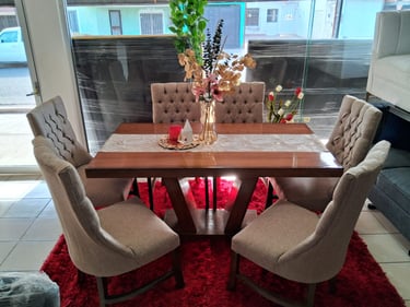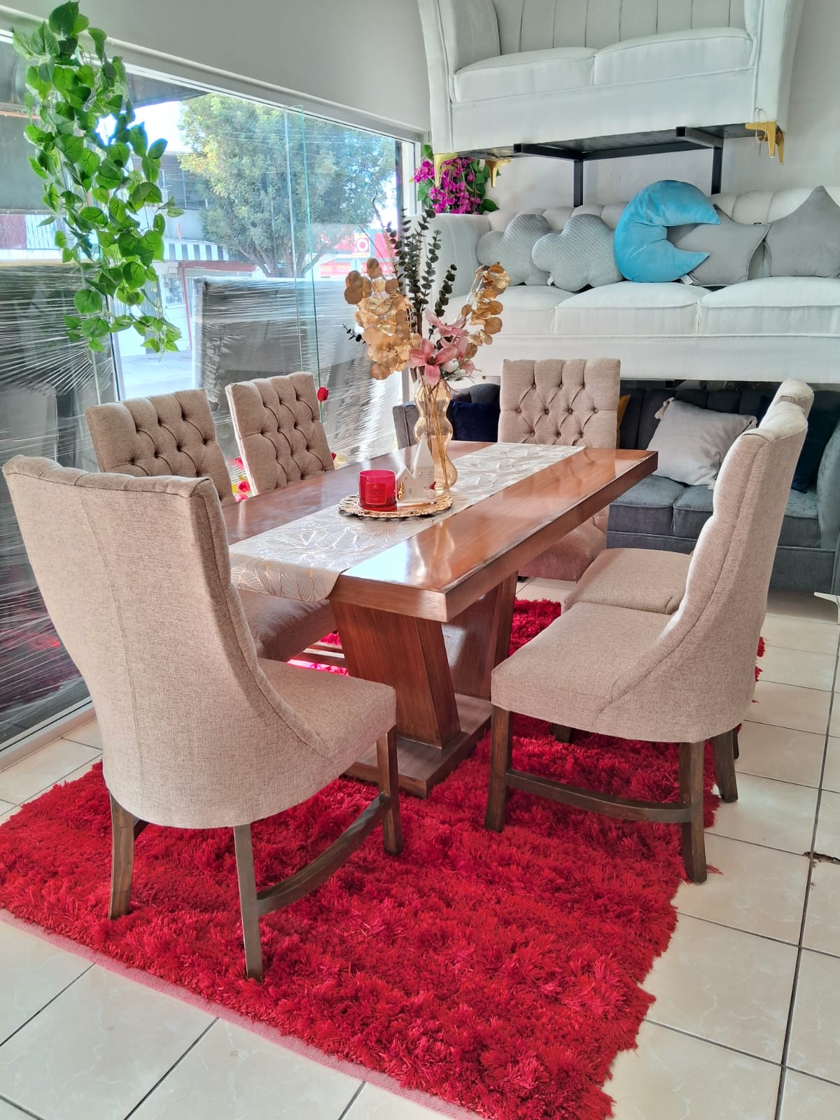 Comedor de diseño contemporáneo que combina elegancia y calidez. Incluye una mesa rectangular de madera con base central sólida que aporta estabilidad y estilo, acompañada de seis sillas tapizadas en tela beige con respaldo capitonado para mayor confort. El conjunto se complementa con un tapete decorativo que realza el espacio, ideal para crear ambientes acogedores y sofisticados. Perfecto para reuniones familiares o cenas especiales, este comedor destaca por su diseño moderno, materiales de calidad y acabados refinados.